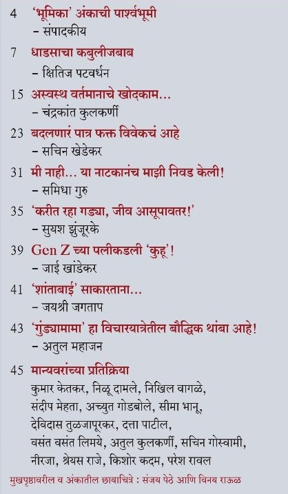 नाटक, साहित्य आणि पत्रकारिता अशा क्षेत्रांतल्या मान्यवरांच्या निवडक 15 प्रतिक्रियांचाही समावेश अंकात केला आहे. नाटकाची अभिरुची आणि सामाजिक भान या दोन्ही संवेदनांना हे नाटक साद घालते, आणि हे विचार लहान वयापासून योग्य पद्धतीने सर्वांपर्यंत पोहोचण्याची गरज आहे, हे या प्रतिक्रियांमधून प्रत्ययास येते. साहित्यिक-सामाजिक विचारवर्तुळांतल्या महत्त्वाच्या ‘ओपिनियन मेकर्स’ (लोकांची मते घडवणारे) ना या नाटकाचे काय महत्त्व वाटते, हे समजून घेण्यासाठी या प्रतिक्रिया मुळातूनच वाचायला हव्यात.