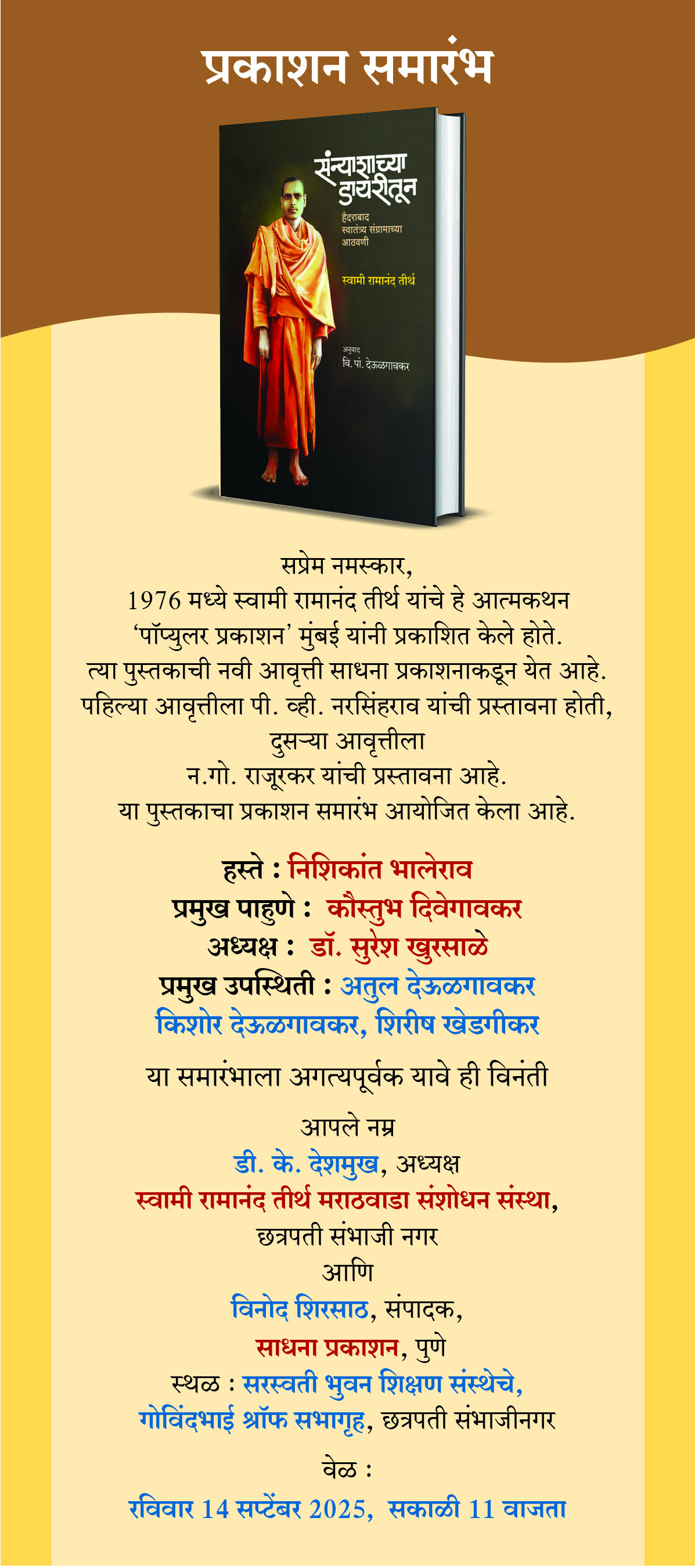 स्वामी रामानन्द तीर्थ यांचा जन्म कर्नाटकातला, बरेचसे शैक्षणिक कार्य व राजकीय कार्य मराठवाड्यातले, त्यांचे राजकीय नेतृत्व तेलंगणात पूर्णपणे विकास तेलंगणातला. अशा रीतीने हैदराबाद संस्थानातल्या सर्व प्रदेशांचे म्हणजे साऱ्या संस्थानचे असे जे अगदी थोडे पुढारी होते त्यांपैकी स्वामीजी एक होते. त्यांचे आत्मचरित्र म्हणजे हैद्राबाद मुक्तिसंग्रामाच्या आणि स्वामीजींच्या कार्यकर्तृत्वाच्या संदर्भातील आद्य आणि सर्वांत महत्त्वाचा दस्तऐवज आहे. मूळ इंग्रजी आत्मचरित्र 1967 मध्ये आले, वि. पां. देऊळगावकर यांनी केलेला मराठी अनुवाद 1976 मध्ये प्रसिद्ध झाला. (दोन्ही भाषांत पॉप्युलर प्रकाशनाकडून पुस्तक आले). गेली काही वर्षे हे पुस्तक विक्रीसाठी उपलब्ध नव्हते. या पुस्तकाच्या प्रकाशनाला लवकरच पन्नास वर्षे पूर्ण होत आहेत, तर त्याची नवी आवृत्ती साधना प्रकाशनाकडून यावी. असा प्रस्ताव अतुल देऊळगावकर यांनी शिरीष खेडगीकर व किशोर देऊळगावकर यांच्या संमतीने दिला. साने गुरुजींनी सुरू केलेल्या साधना प्रकाशनाकडून स्वामीजींचे आत्मकथन येणे औचित्यपूर्ण होईल, या विचाराने हा प्रस्ताव आम्ही स्वीकारला. येत्या 14 सप्टेंबर 2025 ला या नव्या आवृत्तीचे प्रकाशन छत्रपती संभाजी नगर येथे होणार आहे. या आगामी पुस्तकातील हे एक प्रकरण -