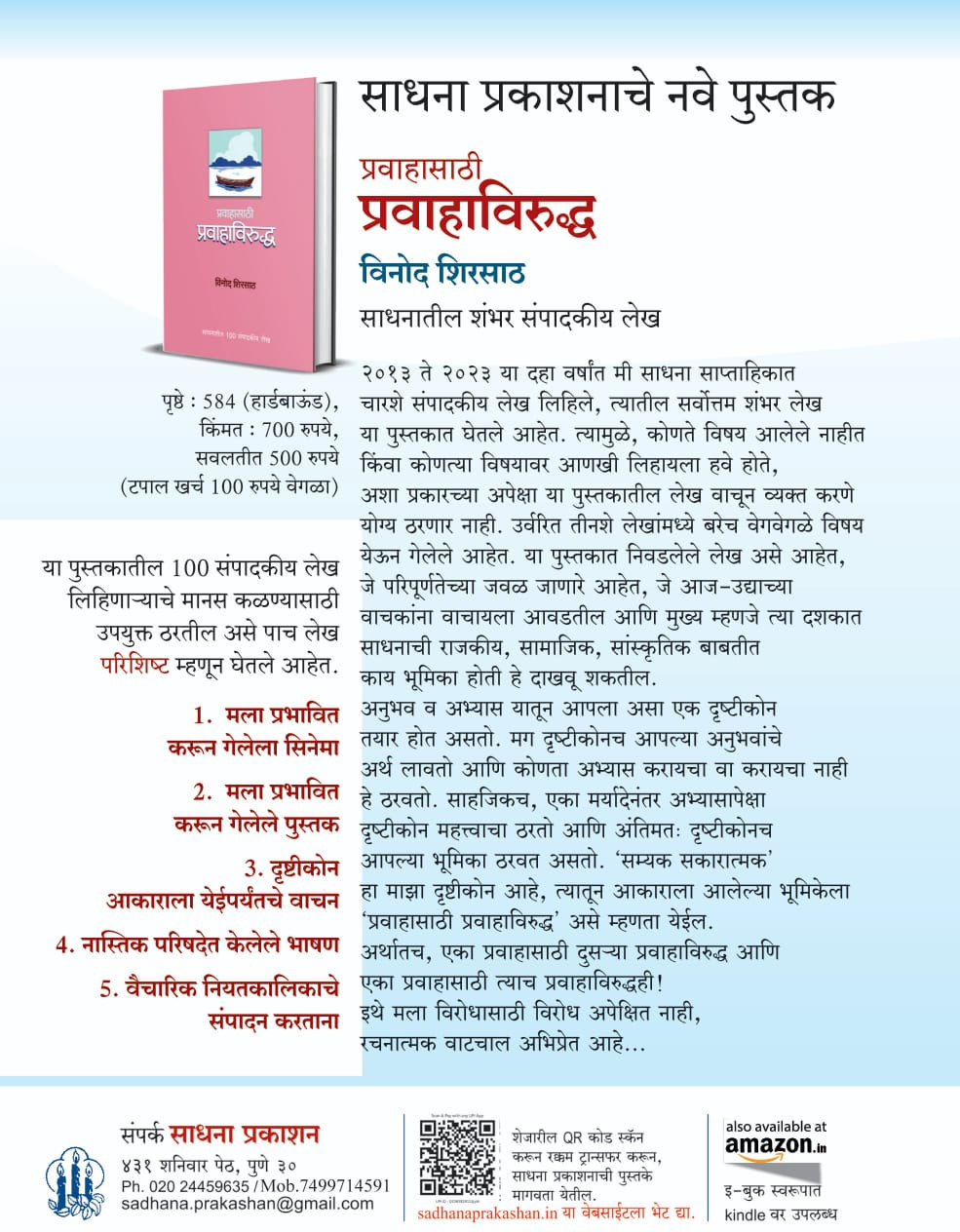 "The articles selected in this book come close to perfection. They are engaging for present and future readers and, above all, reflect Sadhana’s political, social, and cultural position during that decade. Experience and study, together shape one’s perspective. Over time, it is this perspective that interprets experience and decides what is worth studying and what is not. Naturally, beyond a point, perspective matters more than study—and ultimately, it is perspective that defines one’s stance. My perspective can be described as Samyak-Sakaratmak (balanced / right / correct / principled and constructive / positive). The stance that emerges from it may be called Pravahasathi Pravahaviruddha “going against the current, for the sake of the current.” That is, opposing one current in favour of another—or even confronting a current, for it's own good. This is not absolute opposition, but my unwavering commitment to constructive movement forward."- Vinod Shirsath